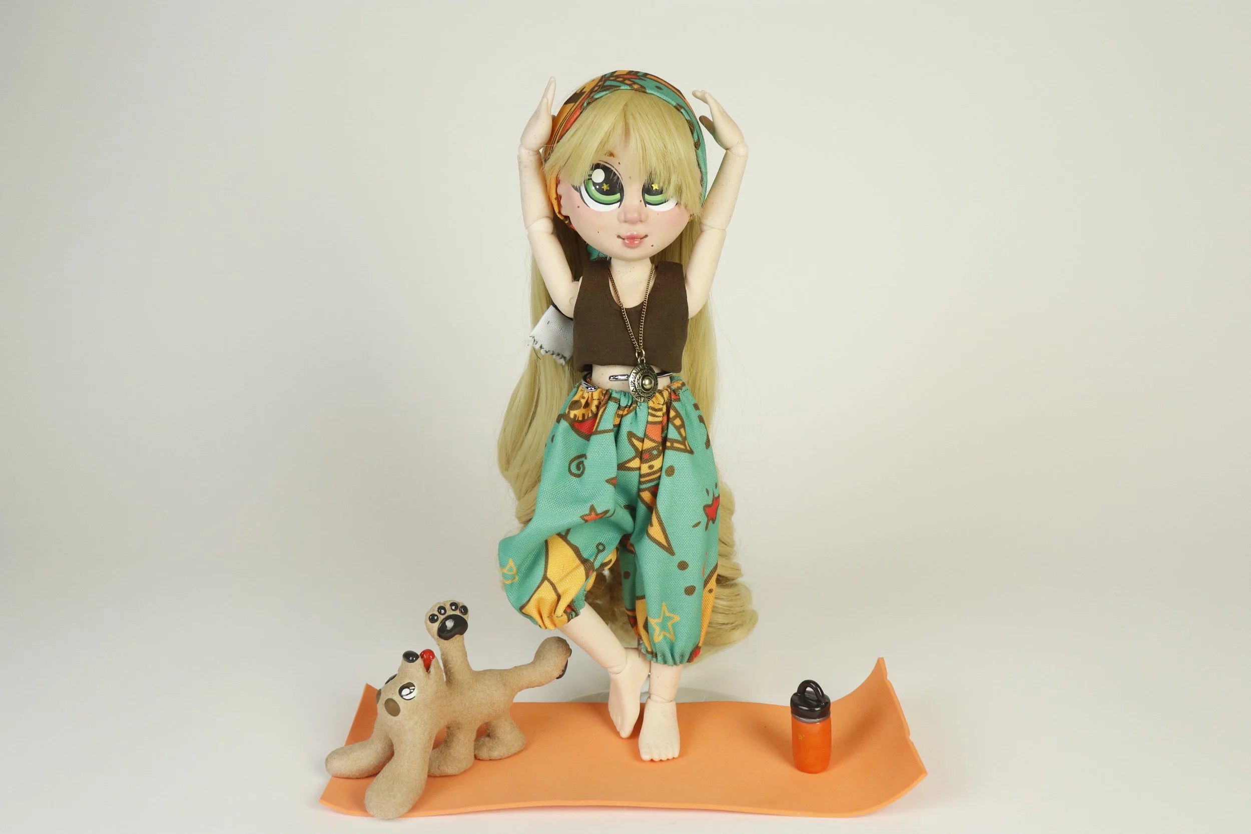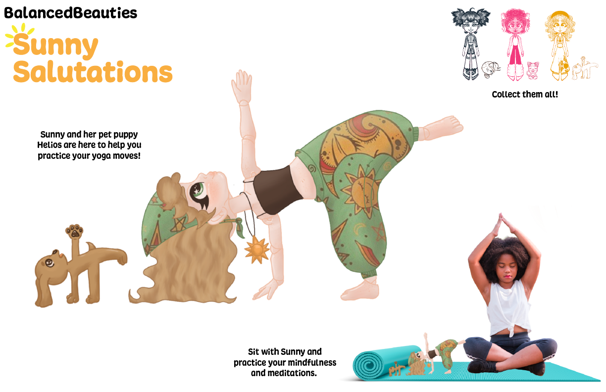 Balanced Beauties is a doll line for children ages 5-12 that encourages mindfulness and wellbeing, through Yoga and other physical activities. This is Sunny Salutations and her dog, Helios!