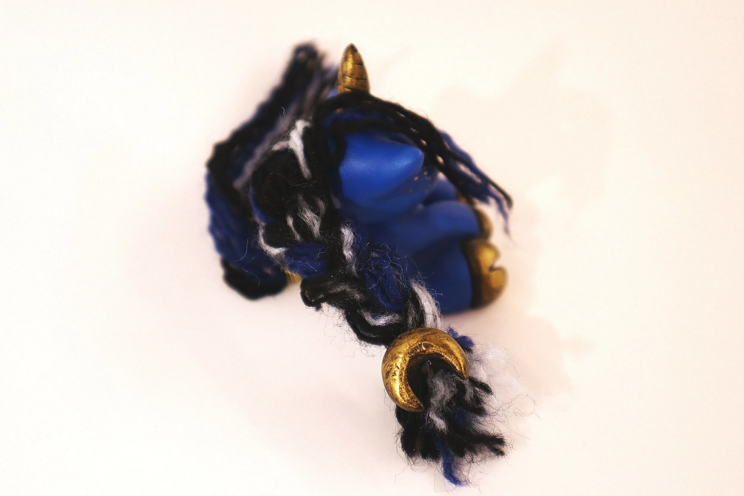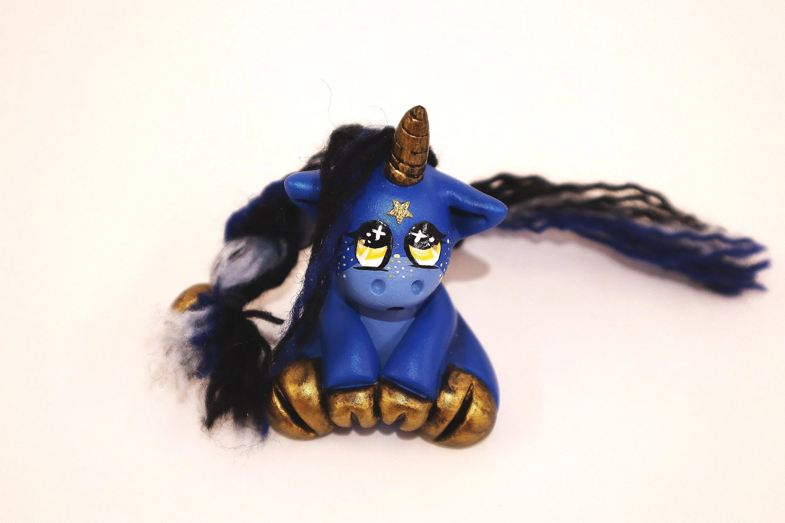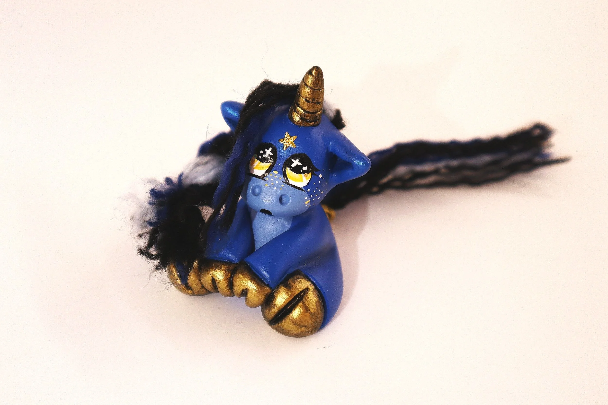 Small unicorn, sculpted with epoxy sculpt. Acrylic yarn for the hair and acrylic paint for the color. My main inspiration was Medieval Star Maps like the ones seen here: